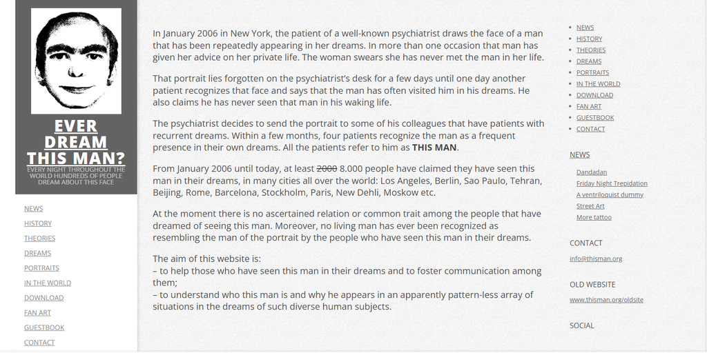 Contrairement à de nombreux sites bizarres de cette liste, Ever Dream This Man ? a un objectif inhabituel. Il vise à informer le public sur un mythe internet qui apparaît dans les rêves des gens depuis 2006. Le site comporte de nombreuses pages web unique couvrant l’histoire du phénomène, les théories et même les œuvres d’art des fans.