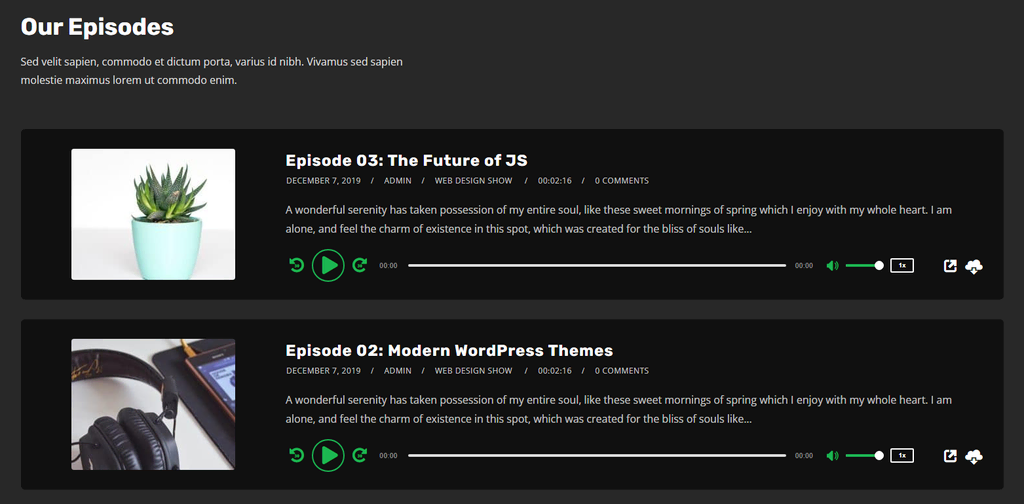 La section Nos épisodes du site démo du thème Tusant montrant les lecteurs de podcasts.
