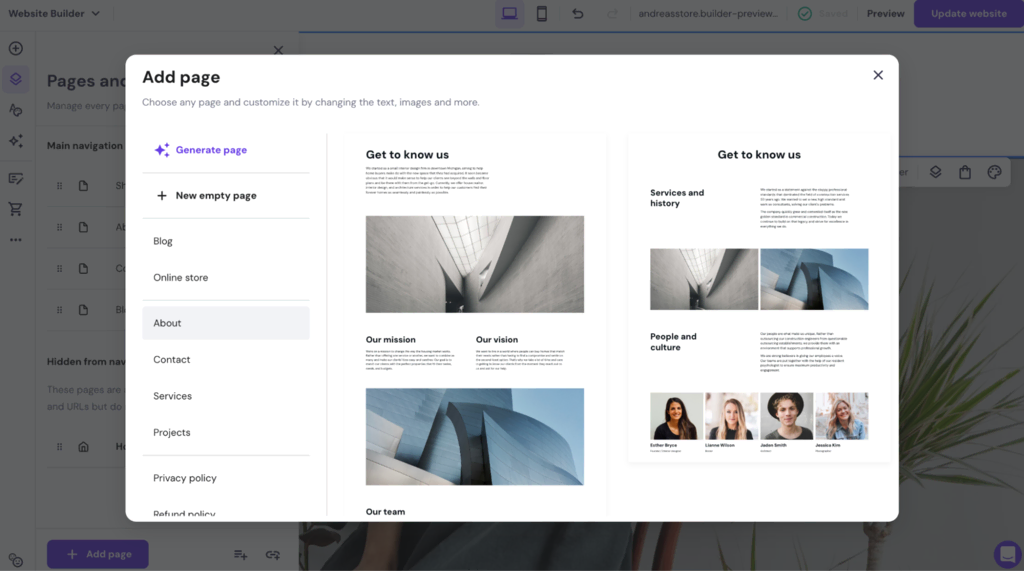 1. Click on + Add page to add a new page to your website. Select from pre-made templates, generate a page with AI, or add a new empty page.
