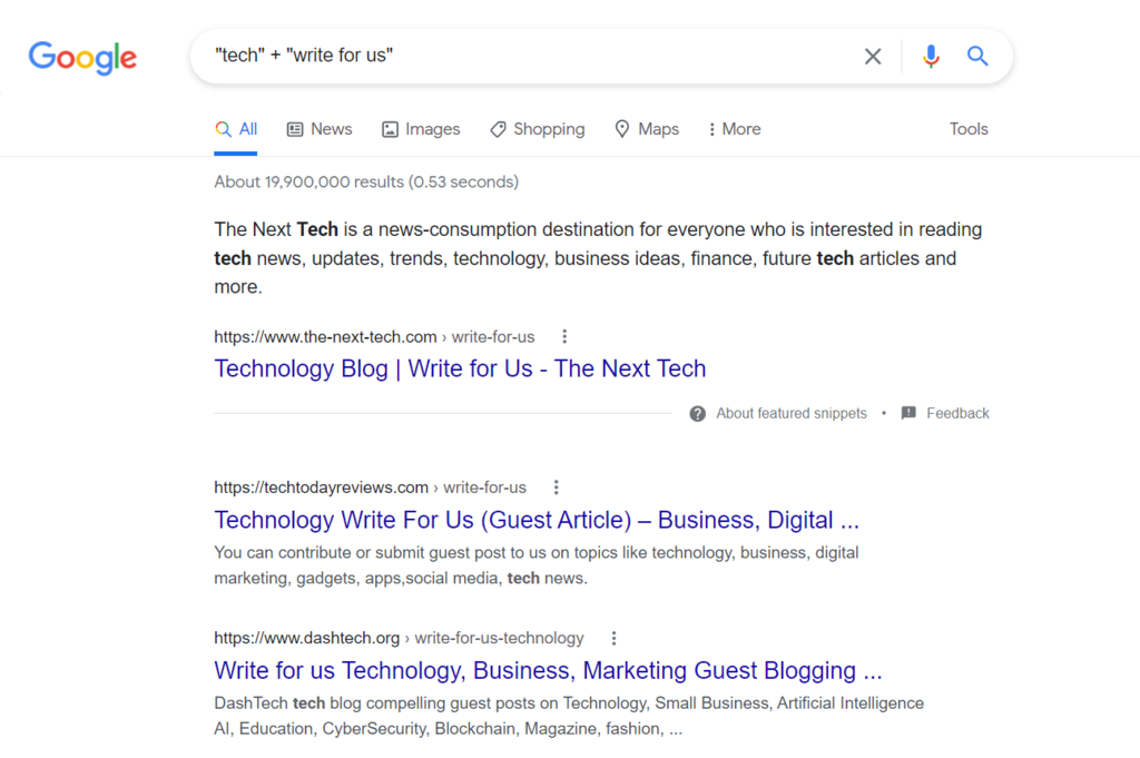 Here’s an example of what the “tech” + “write for us” query results look like: