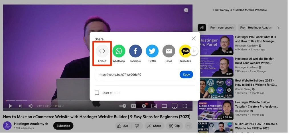 1. A popup will appear with the different ways you can share the video. Select the Embed option.