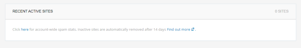 To view your Akismet stats, go to your account page and scroll down to the bottom to find the Recent Active Sites menu.