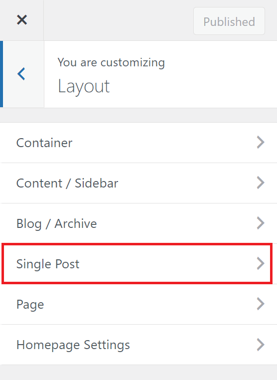 - In the Customizer, select Layout → Single Post to access the settings for individual blog posts.