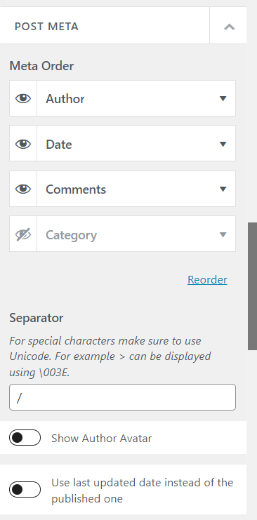 - Under POST META, adjust the meta information order (like date and author), enable the display of author avatars for posts, and choose to show the last updated date instead of the publication date.