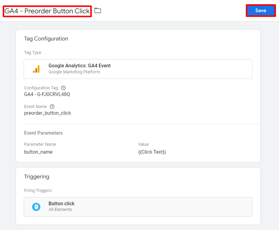 - Create a name for the tag and click Save. As it is possible to have several containers under the same user account, name your tag with your measurement ID to help you identify each tracking tag quickly.