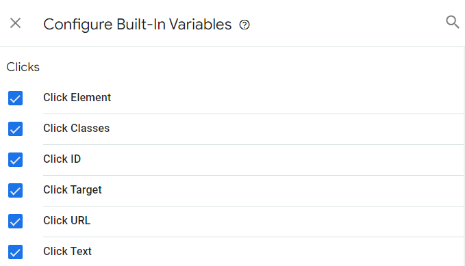 - Scroll down to Clicks and enable all the clicks variables.