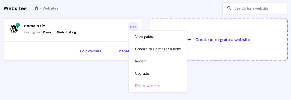 - Navigate to the Websites section and select Create or migrate a website. Follow the steps and choose Hostinger Website Builder as your platform.