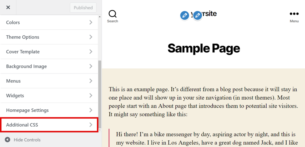 - Navigate to Appearance -> Customize, then click on Additional CSS.