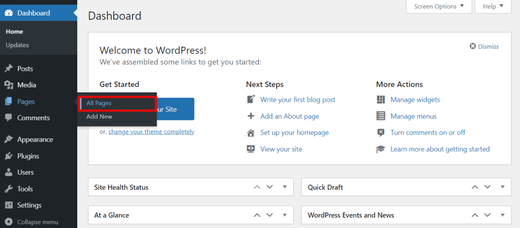 - Access your WordPress dashboard and go to Pages -> All Pages.