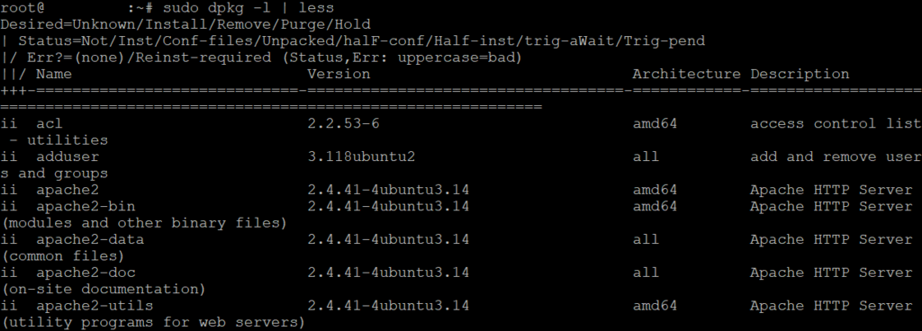 Users can also list the LOG files within the /var/log/apt directory path to check what packages have been removed, updated, or deleted. To do so, use the less command: