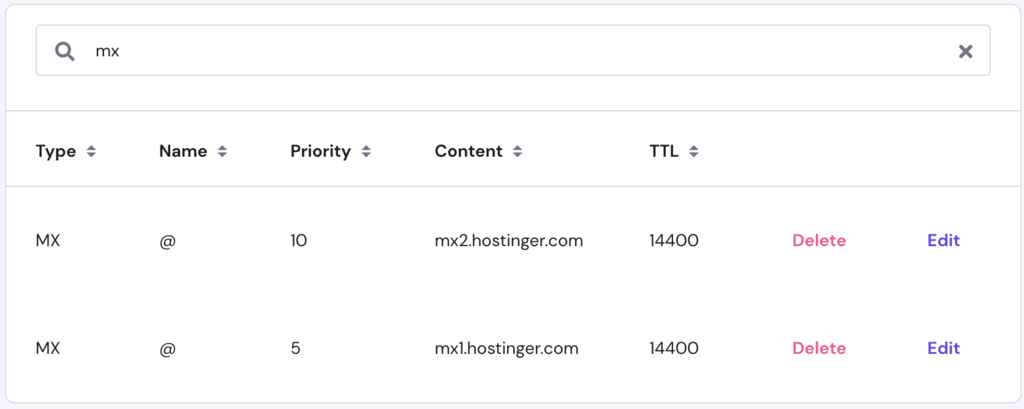 At Hostinger, the MX records can also be found in the DNS Zone Editor.