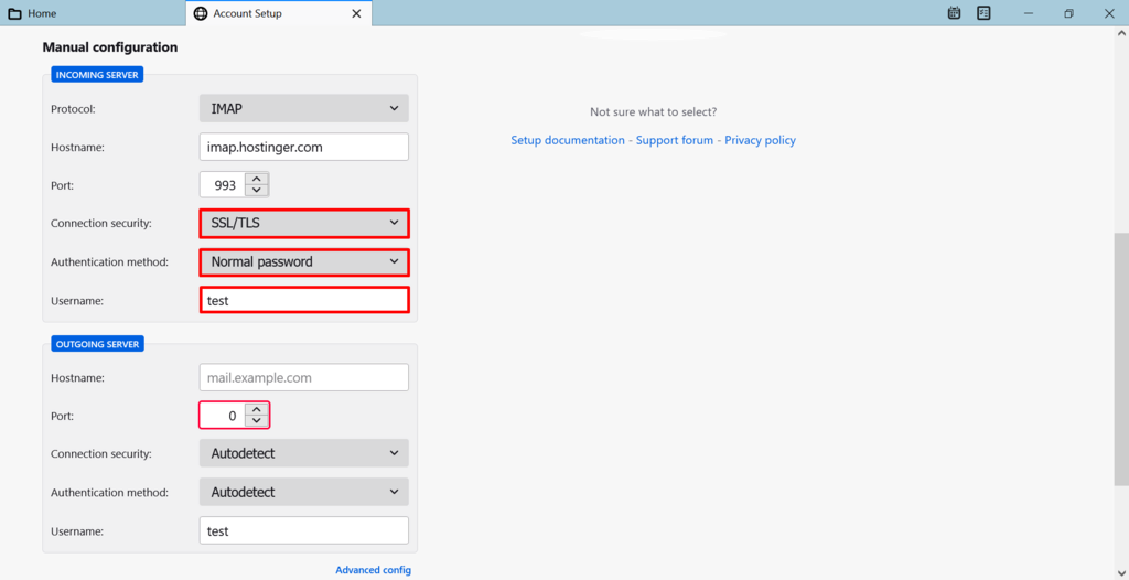 The manual configuration options will appear on the same page. Here, edit the server names, ports, and security settings based on the configuration details you’ve collected. Configure any additional account settings as needed.