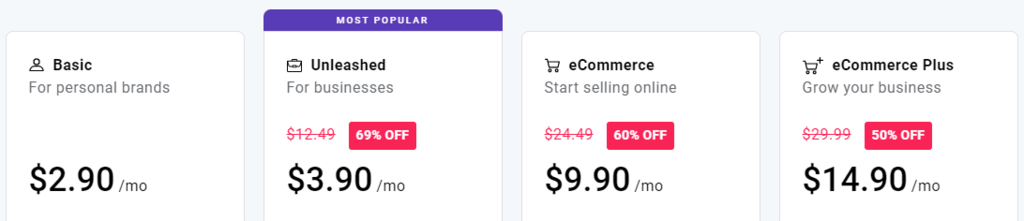 Website builders offer several plans with different feature packs. For example, the basic or most affordable plan may not include web analytics, while higher-tier eCommerce plans usually have payment integration and email marketing features.