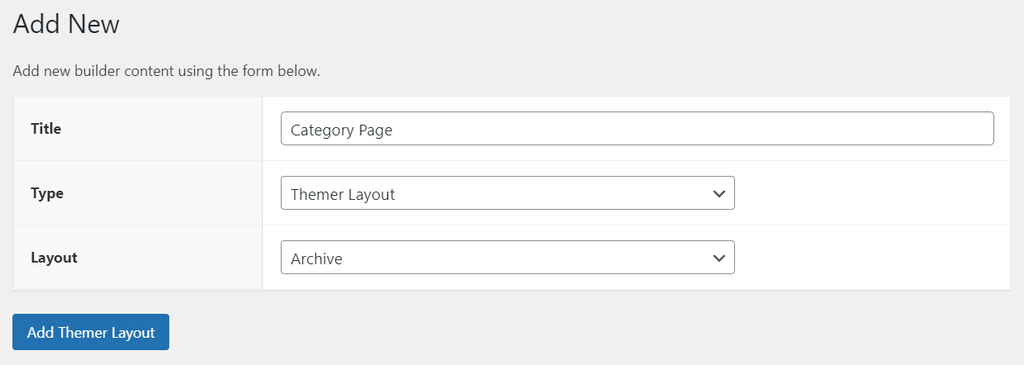 - Enter the Title of the page, choose Themer Layout as the Type, and Archive as the Layout. Proceed by clicking Add Themer Layout.