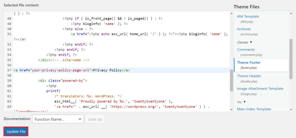 - Within the footer.php file, find the spot where you want to insert the link to your privacy policy page.