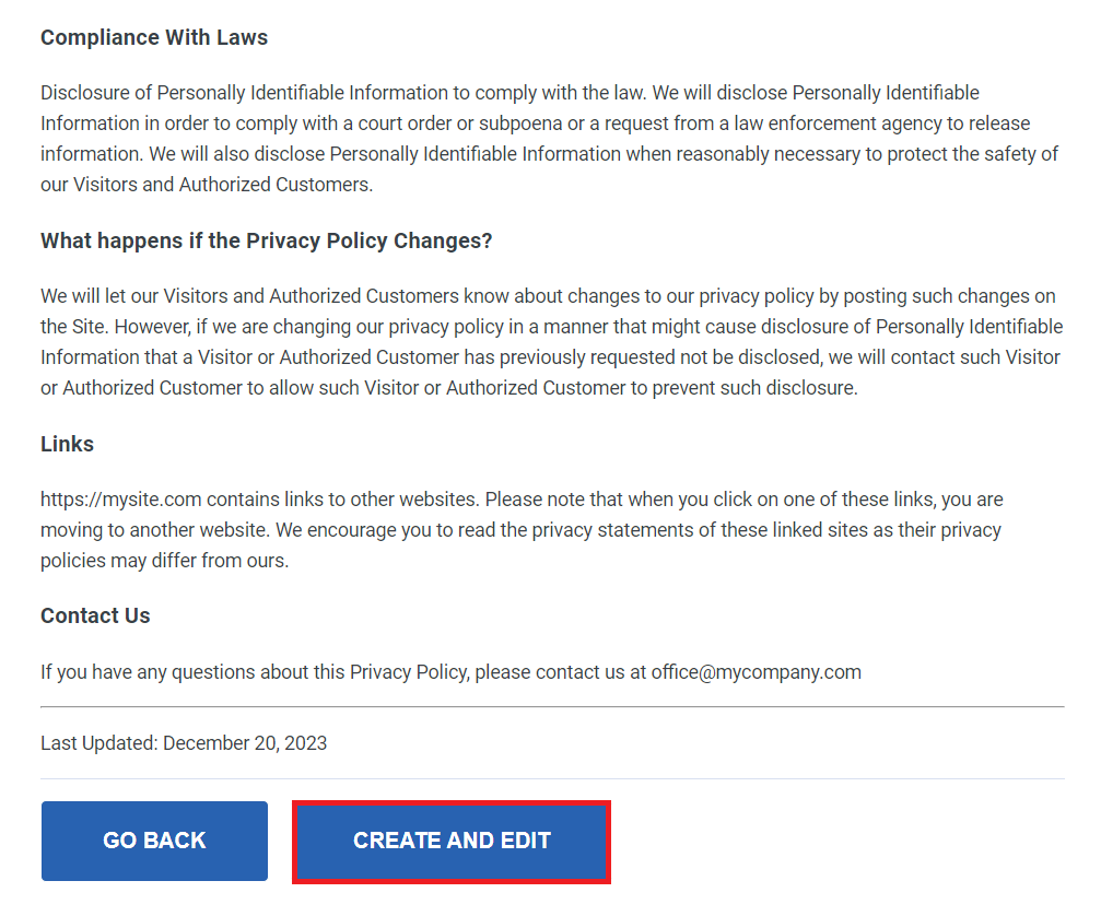 - The plugin will automatically generate a custom privacy policy draft. Scroll down and select CREATE AND EDIT, leading to the WordPress editor.