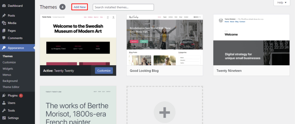 - Navigate to Appearance → Themes from your WordPress dashboard. Click on the Add New button at the top of the page.