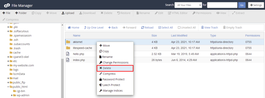 If your hosting provider uses cPanel, you can access your WordPress files through its File Manager. The process is similar to that of hPanel’s File Manager.